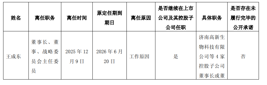 公告顯示,濟(jì)南高新發(fā)展股份有限公司董事會(huì)近日接到王成東、賈為、吳寶健、雷學(xué)鋒、楊繼華提交的辭職報(bào)告。因工作原因,王成東辭去公司董事長、董事及戰(zhàn)略委員會(huì)主任委員等職務(wù);賈為辭去董事職務(wù);吳寶健辭去董事及戰(zhàn)略委員會(huì)委員職務(wù);雷學(xué)鋒辭去董事及薪酬與考核委員會(huì)委員職務(wù);楊繼華辭去公司董事會(huì)秘書職務(wù)。其辭職報(bào)告自2025年12月9日送達(dá)公司董事會(huì)之日起生效。