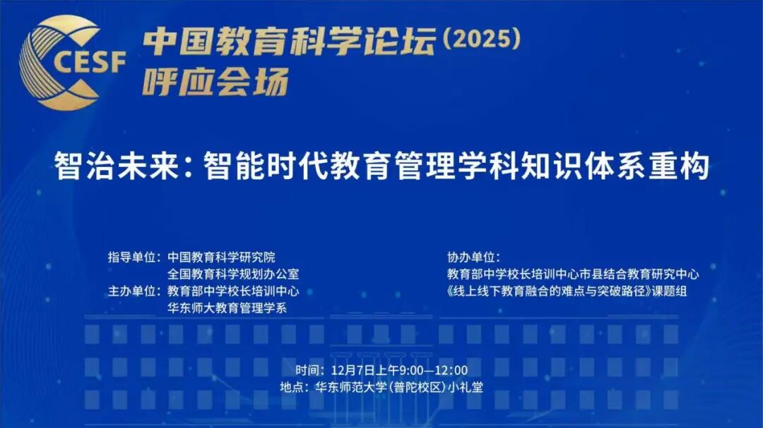 2025年12月7日,作為中國教育科學論壇(2025)的呼應會場,“智治未來:智能時代教育管理學科知識體系重構”研討活動在華東師范大學召開。本次研討活動由中國教育科學研究院、全國教育科學規劃辦公室指導,教育部中學校長培訓中心、華東師大教育管理學系主辦,教育部中學校長培訓中心市縣結合教育研究中心、“線上線下教育融合的難點與突破路徑”課題組協辦。