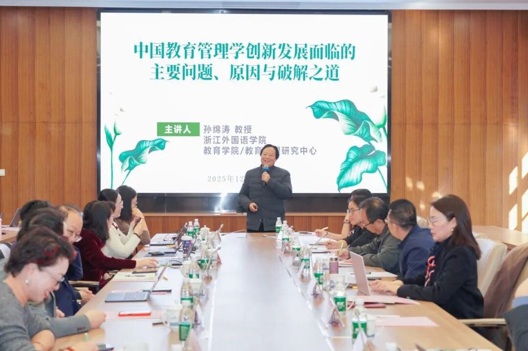 浙江外國語學院特聘教授、教育治理研究中心主任孫綿濤分享了題為“中國教育管理學創新發展面臨的主要問題、原因與破解之道”的報告,系統梳理了當前中國教育管理學創新發展面臨四個主要問題:一級學科歸屬不定、教育管理學稱謂隨意、學科與相關學科的屬種關系不清和學科研究對象及教育管理與教育治理研究關系的論域不定。他認為問題根源在于未能正確處理學科發展與社會發展之間、學科內外部之間的關系。破解之道在于遵循學科發展規律、厘清研究對象、把握教育管理與教育治理關系,并運用馬克思歷史唯物主義實踐第一性原理分析教育管理現象,構建具有中國特色的教育管理學學科體系。