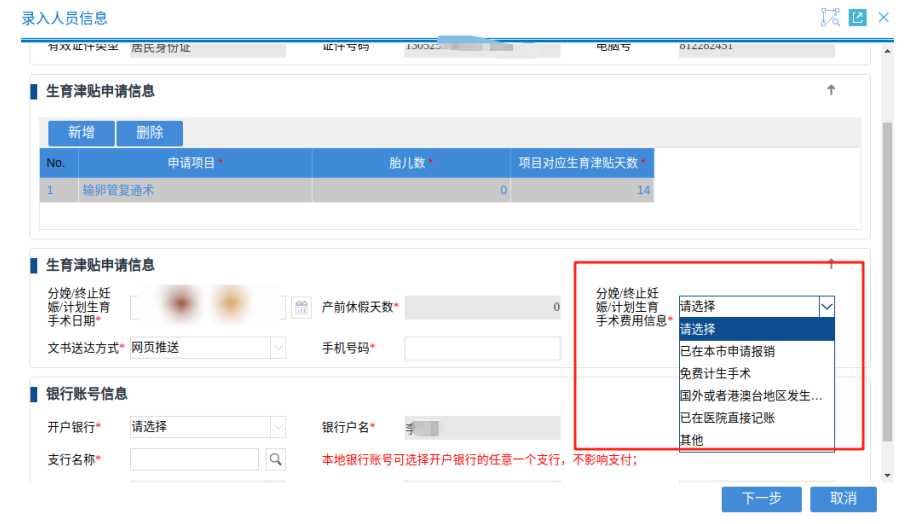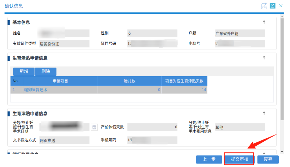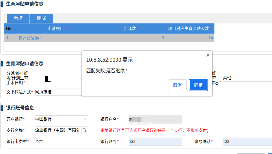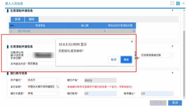 隨后錄入人員信息,填寫生育津貼申請信息、銀行賬戶信息,系統(tǒng)匹配成功后,點擊“確認”;