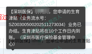 系統(tǒng)審核完畢后,會有短信告知大家審核情況。(生育津貼將在10個工作日內(nèi)到賬)