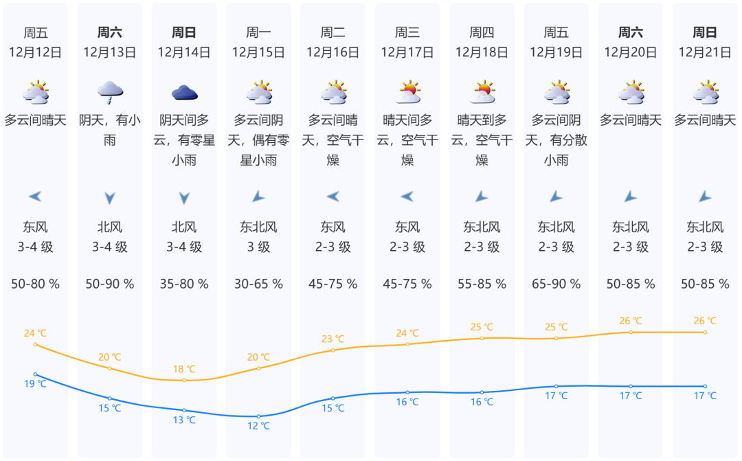 12月12日,多云間晴天;19℃-24℃;東風(fēng)3-4級(jí);相對(duì)濕度50-80%。