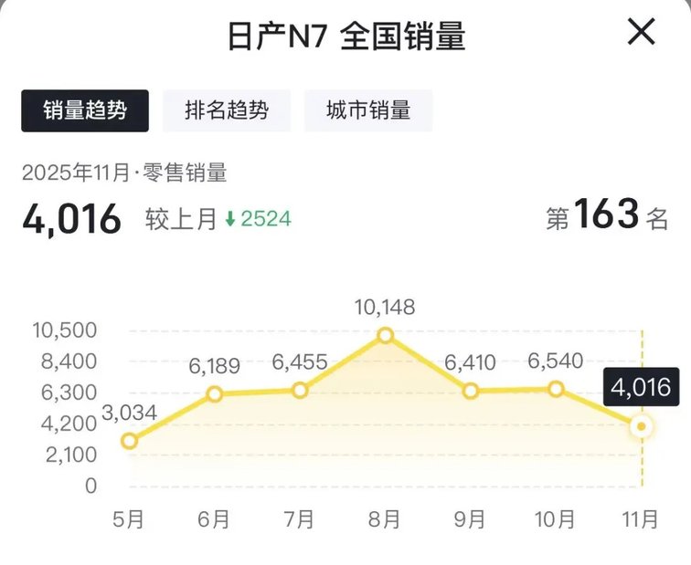 但與光鮮的產(chǎn)能數(shù)據(jù)形成強(qiáng)烈反差的是,日產(chǎn) N7 的市場(chǎng)銷量正急速降溫。8 月創(chuàng)下超萬(wàn)輛的銷量峰值后,其銷量便開(kāi)啟逐月下滑模式:10 月銷量 6540 輛,11 月直接跌至 4016 輛,環(huán)比暴跌 39.4%,半年后的市場(chǎng)表現(xiàn)已然承壓。