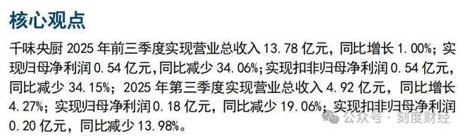 2025年第三季度財報中,千味央廚的前三季度實現營業收入13.78億元,同比僅增長1.00%,基本與上年持平,但歸屬于上市公司股東的凈利潤僅為5377.55萬元,同比大幅下滑34.06%??鄯莾衾麧櫷较禄?4.15%。
