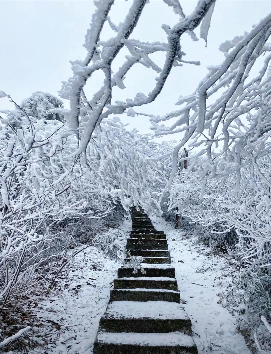 若說起雪的壯闊,家鄉的韶山,便是另一番氣象了。幾個知心的伙伴,挑了這樣的日子去爬山,那真是頂風雪的豪舉了。山路是斷乎尋不見的,全憑著往日記憶里大致的方位,深一腳、淺一腳地向上跋涉。風裹著雪粒,打在臉上,微微的刺痛。但誰也不肯說回頭的話。到了山腰,回望來路,早已被新雪覆平,仿佛我們是從一片混沌的、無始無終的潔白里憑空生出來的一般。山上的松柏,此刻成了最好的雪與冰的載體。厚厚的雪覆在墨綠的針葉上,下面又垂著長長的、晶瑩的冰掛,陽光偶爾從云隙里漏下一點,那冰掛便折射出七彩的光,璀璨得不似人間之物。這便是所謂的“霧凇沆碭”了。四下里萬籟俱寂,只有風過處,枝頭的積雪“撲簌簌”跌落的聲音,反而襯得這山更加的空靜。這時,遠處云門寺的鐘聲,悠悠地傳了過來。那聲音穿過厚重的雪幕,失了往日的清越,變得渾厚而蒼茫,一聲,又一聲,不像是敲在銅鐘上,倒像是直接撞在這漫山的冰雪上,又反彈到心里去。那聲音里有股子讓人心安的力量,仿佛能滌盡胸中所有的塵濁。我們便都立住了腳,靜靜地聽,誰也不說話,仿佛一開口,便會玷污了這份天地間至純至靜的禪意。