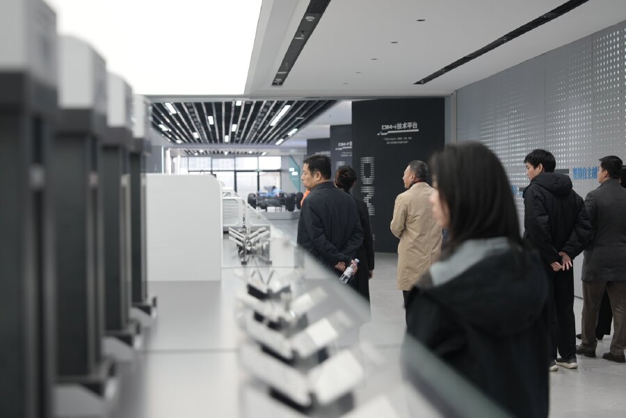在展示中心,高管們看到了比亞迪從電池、電機到整車的多種產品線。其中,最引人注目的是中央展臺上一臺被“解剖”的比亞迪海豹電動汽車。面對這個內部結構一目了然的大“玩具”,他們紛紛拿出手機記錄。