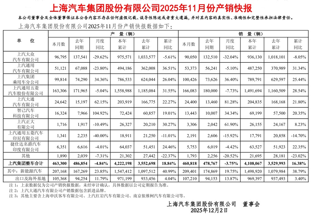 根據上汽集團公布的11月份產銷快報顯示,上汽集團今年前11個月累計銷量超過410萬臺,其中,11月銷量460818臺。盡管與比亞迪4182038臺的累計銷量相比還略遜一籌,但上汽集團在爭奪集團年度銷冠方面,還是與比亞迪有一較高下的機會,只不過難度還是有的。