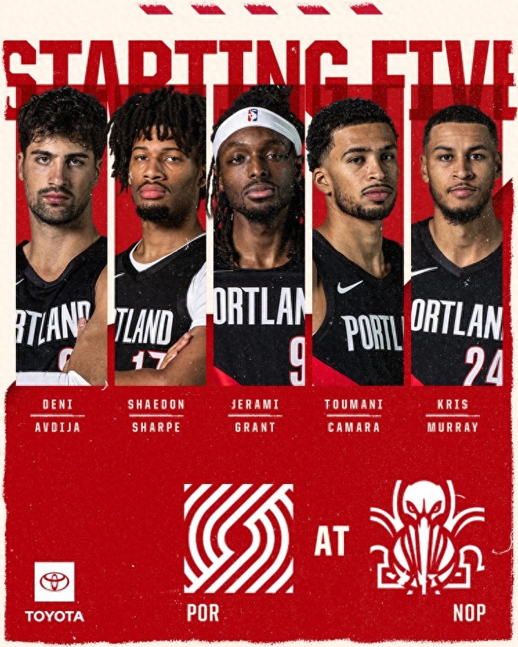 開拓者VS鵜鶘首發:阿夫迪亞領銜五小出戰 奎因攜長臂鋒線陣應敵