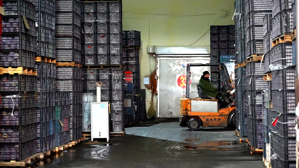 12月11日,冷庫內(nèi),數(shù)千噸阿克蘇冰糖心蘋果依托先進(jìn)的冷鏈技術(shù),實(shí)現(xiàn)高標(biāo)準(zhǔn)保鮮儲(chǔ)存。(艾海提·毛勒吐爾迪 攝)