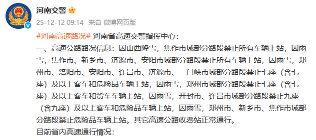 一、高速公路路況信息:因山西降雪,焦作市域部分路段禁止所有車輛上站,因雨雪,焦作市、新鄉市、濟源市、安陽市域部分路段禁止所有車輛上站,因雨雪,鄭州市、洛陽市、安陽市、許昌市、濟源市、三門峽市域部分路段禁止七座(含七座)及以上客車和危險品車輛上站,因雨雪,鄭州市域部分路段禁止七座(含七座)及以上客車和貨車車輛上站,因雨雪,開封市、許昌市域部分路段禁止九座(含九座)及以上客車和危險品車輛上站,因雨雪,鄭州市、新鄉市、焦作市域部分路段禁止危險品車輛上站。其它高速公路收費站正常通行。