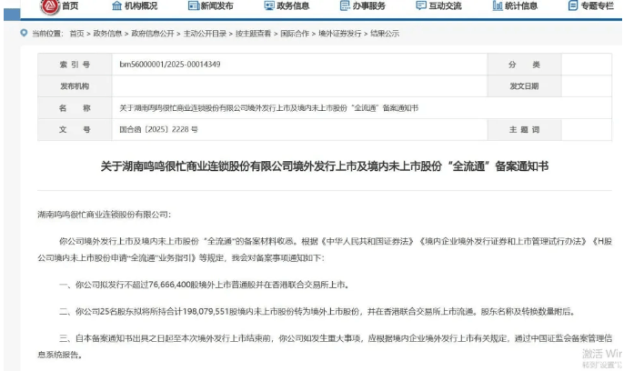 12月11日,中國證監(jiān)會發(fā)布《關(guān)于湖南鳴鳴很忙商業(yè)連鎖股份有限公司境外發(fā)行上市及境內(nèi)未上市股份“全流通”備案通知書》顯示,量販零食企業(yè)湖南鳴鳴很忙商業(yè)連鎖股份有限公司(簡稱“鳴鳴很忙”)境外發(fā)行上市備案已獲通過。根據(jù)備案,公司擬發(fā)行不超過7666.64萬股境外上市普通股,另有25名股東擬將所持約1.98億股境內(nèi)股份轉(zhuǎn)為境外上市股份。