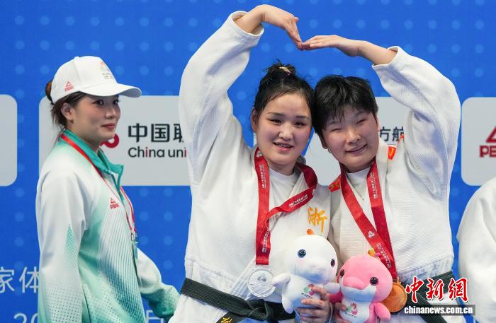 12月11日,在盲人柔道女子J1-70公斤級(jí)頒獎(jiǎng)儀式上,金牌得主湖南隊(duì)選手劉立(右)與銀牌得主浙江隊(duì)選手林樹明(中)“比心”合影。 (殘?zhí)貖W會(huì)信息服務(wù) 供圖)