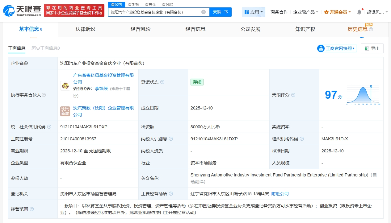 天眼查工商信息顯示,近日,沈陽汽車產業投資基金合伙企業(有限合伙)成立,執行事務合伙人為沈汽新致(沈陽)企業管理有限公司、廣東省粵科母基金投資管理有限公司,出資額8億人民幣,經營范圍包括創業投資、以私募基金從事股權投資、投資管理、資產管理等…