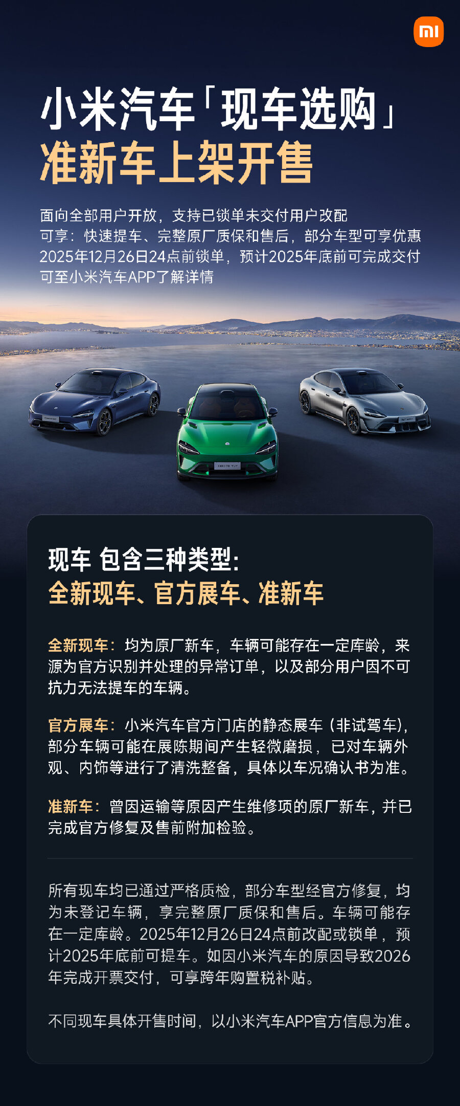 小米汽車稱,現(xiàn)車包含全新現(xiàn)車、官方展車、準(zhǔn)新車,已通過(guò)嚴(yán)格質(zhì)檢,可享快速提車、完整原廠質(zhì)保和售后,部分車型可享優(yōu)惠。面向所有用戶開(kāi)放,已鎖單未交付的用戶可改配。