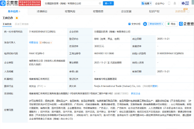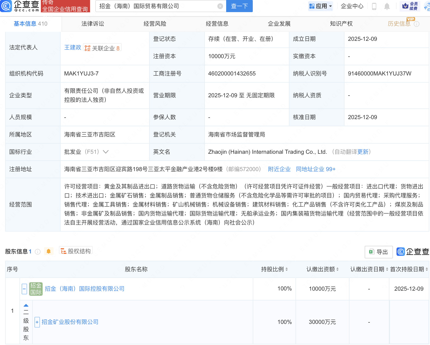 企查查APP顯示,近日,招金(海南)國際貿(mào)易有限公司成立,注冊資本1億元,經(jīng)營范圍包含:煤炭及制品銷售;非金屬礦及制品銷售;國內(nèi)貨物運輸代理;國際貨物運輸代理等。企查查股權(quán)穿透顯示,該公司由招金礦業(yè)(01818.HK)間接全資持股。