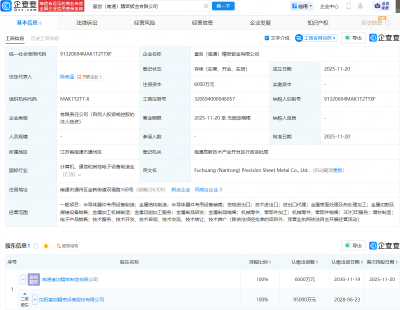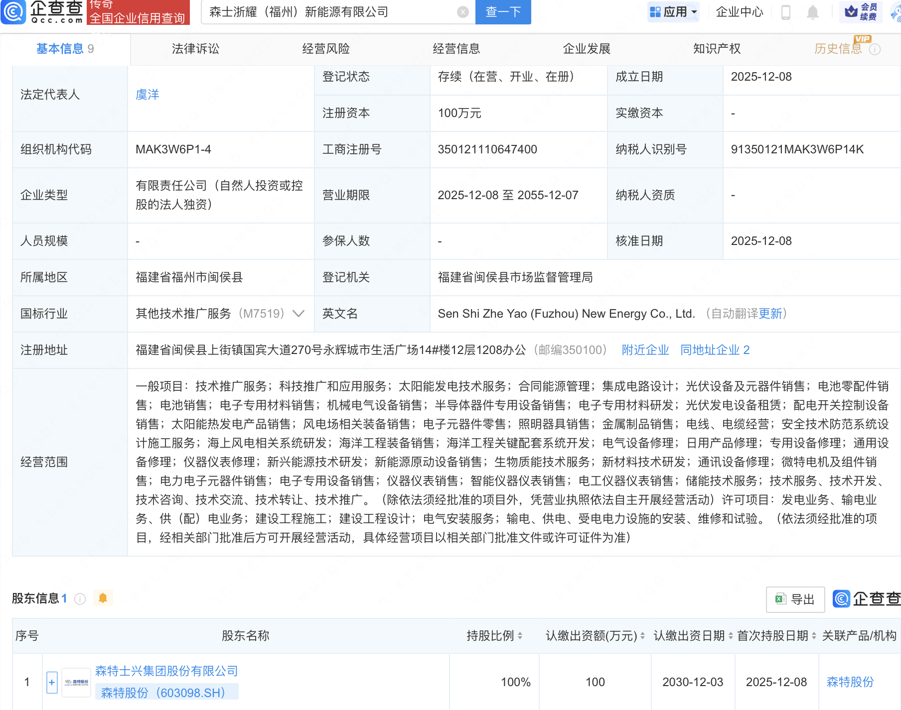 企查查APP顯示,近日,森士浙耀(福州)新能源有限公司成立,經營范圍包含:集成電路設計;半導體器件專用設備銷售;電子專用材料研發;光伏發電設備租賃等。企查查股權穿透顯示,該公司由森特股份(603098)全資持股。