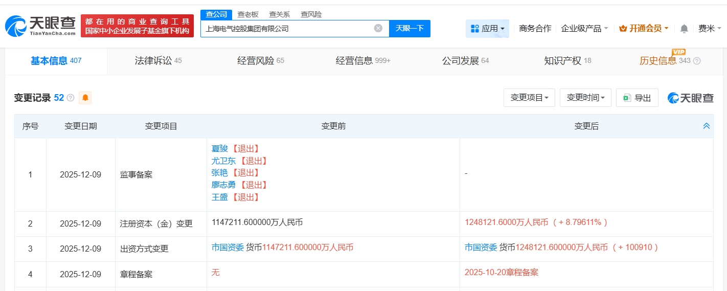 雷達(dá)財(cái)經(jīng)訊,天眼查App顯示,近日,上海電氣控股集團(tuán)有限公司發(fā)生工商變更,注冊(cè)資本由約114.72億人民幣增至約124.81億人民幣,增幅約9%,同時(shí)多位高管發(fā)生變更。