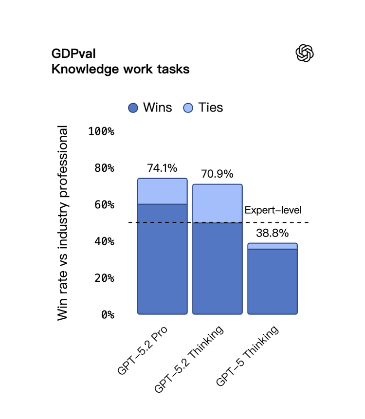 GPT-5.2 Thinking 在?70.9%?的任務上能打平或者贏過行業專家