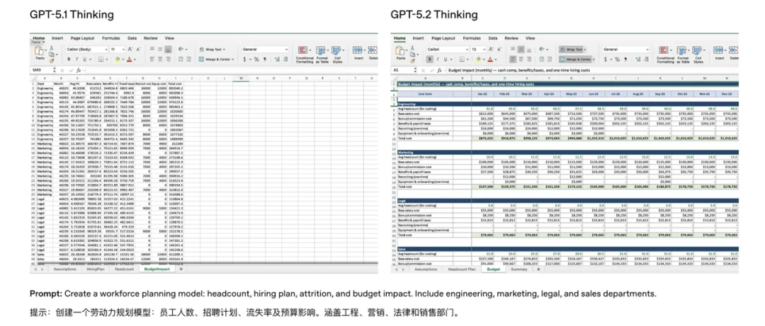 OpenAI官方也放了一些工作中的案例,比如,同樣是讓模型做一個勞動力規劃表格(包含員工人數、招聘計劃、流失率和預算影響),5.1 輸出的是一堆原始數據堆砌,5.2 則自動按部門分類、加上顏色標注和清晰的層級結構,看起來像是有人真的用心排過版。
