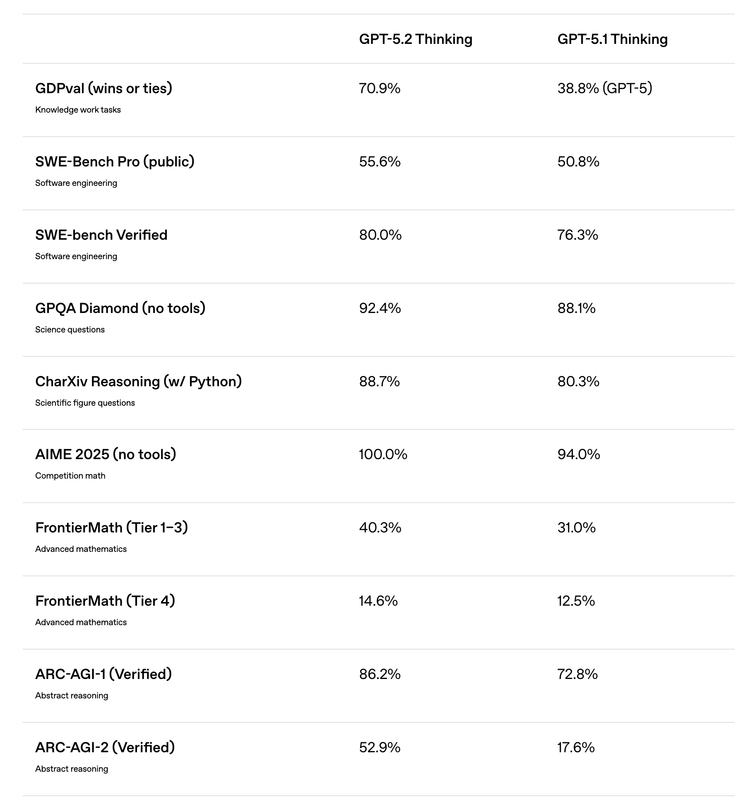 Anthropic 的 Claude 最近在這類任務上同樣進步明顯,但從 5.2 的發力方向來看,OpenAI 顯然想在"AI 替代知識工作"這條賽道上搶先卡位。