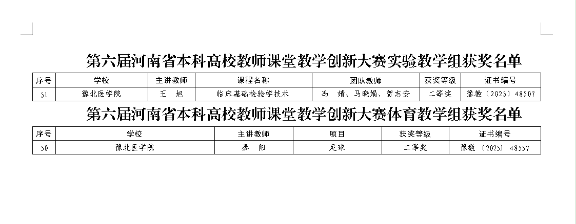 近日,第六屆河南省本科高校教師課堂教學創新大賽獲獎名單揭曉,豫北醫學院教師在此次比賽中表現優異,共獲兩項二等獎。其中,醫學檢驗學院王旭老師主持的《臨床基礎檢驗學技術》課程(團隊成員:馮婧、馬曉娟、賀志安)榮獲實驗教學組二等獎;體育部秦陽老師主持的《足球》課程榮獲體育教學組二等獎。此次獲獎充分體現了豫北醫學院教師在教學理念、教學模式與教學方法上的持續創新,也彰顯了學校在推動課堂教學改革、提升育人質量方面的扎實成效。