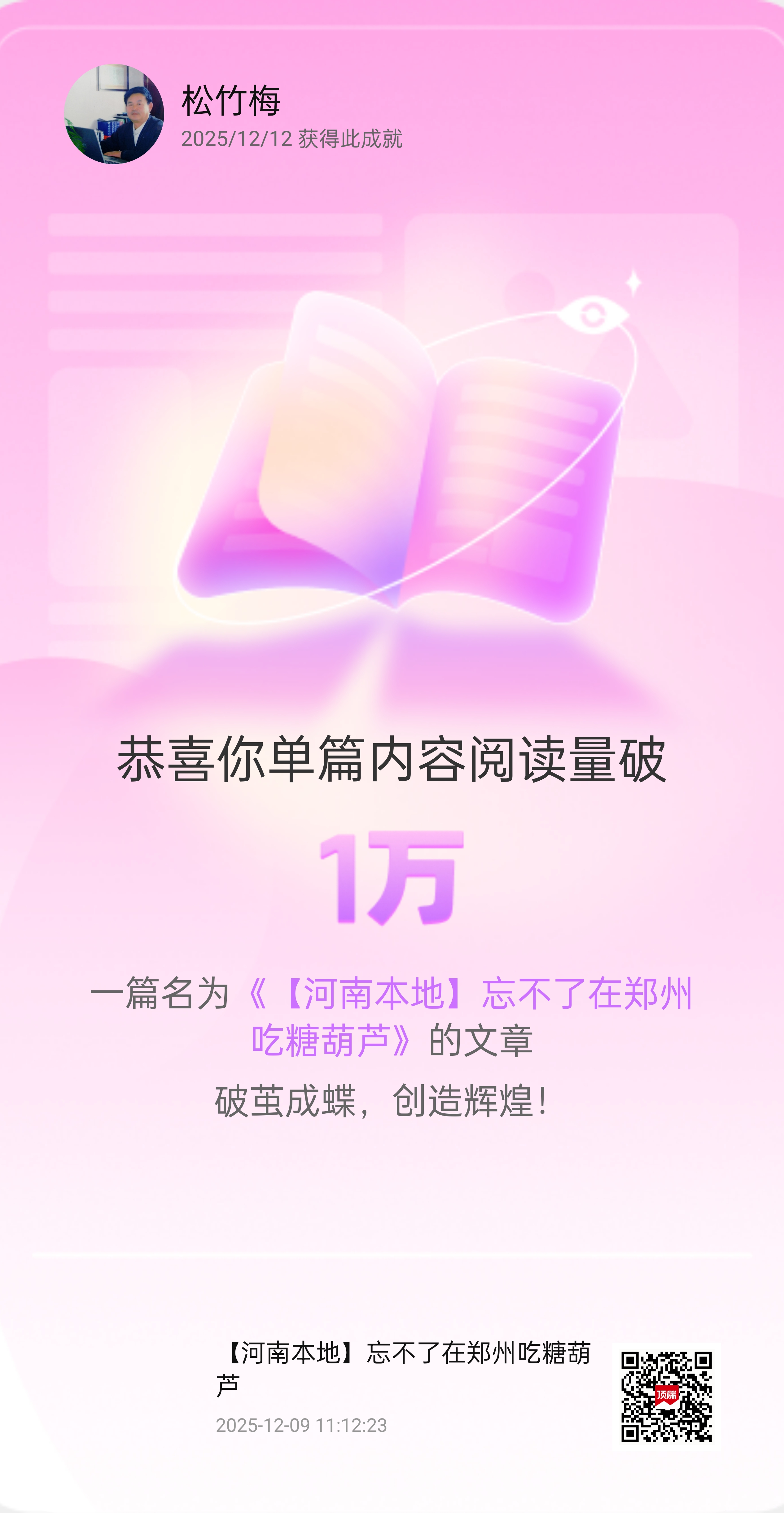 我的拙作《忘不了在鄭州吃糖葫蘆》單篇閱讀量突破一萬,謝謝各位朋友!