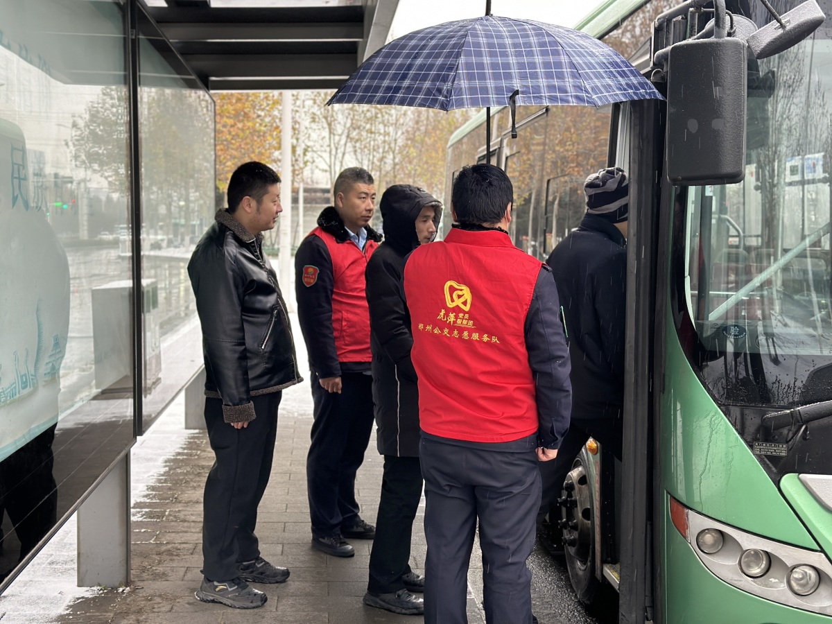 除此之外,鄭州公交“虎萍黨員幫幫團”志愿者還來到公交站牌,協助引導車輛平穩進站、維護站臺乘車秩序,還向候車市民普及雨雪天防滑、安全乘車常識。針對老年乘客、攜帶大件行李的旅客等特殊群體,志愿者紛紛上前幫扶,助力其安全上下車,用細致服務傳遞公交溫情。