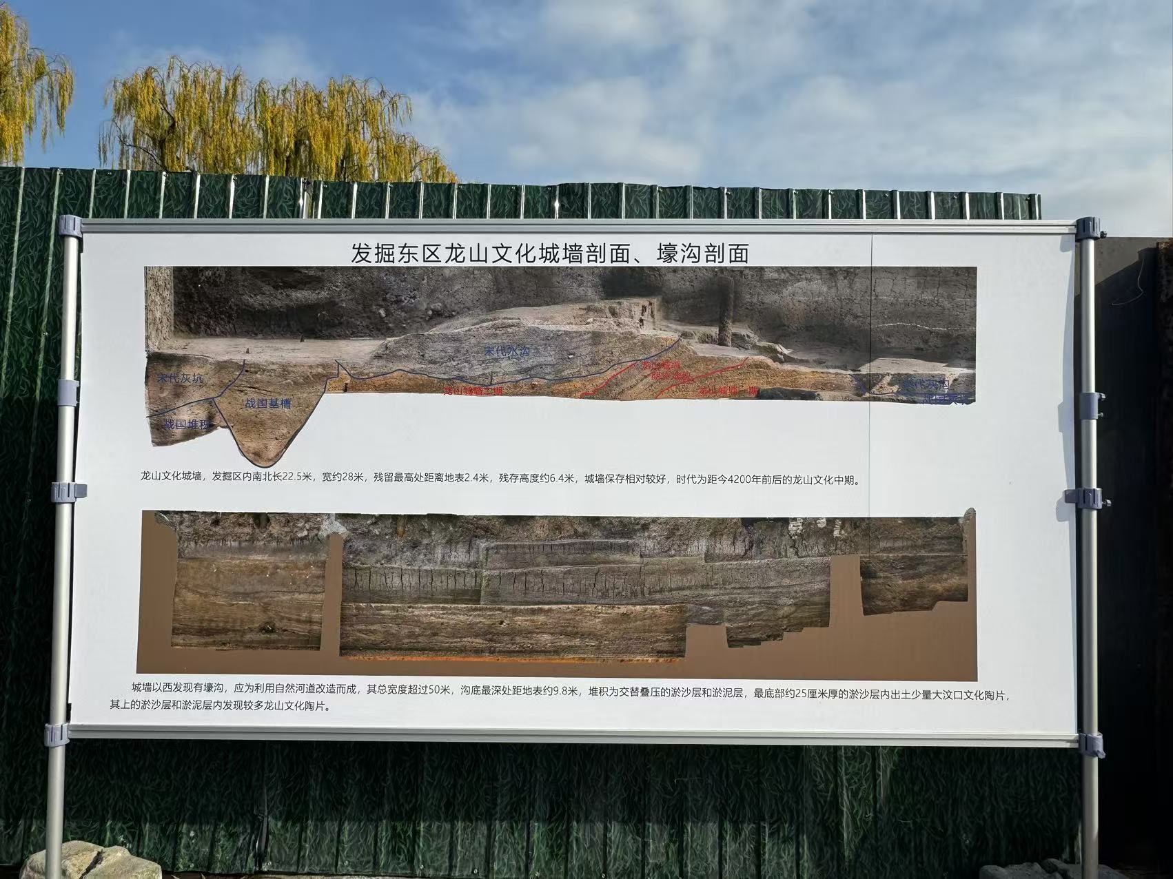 城墻以西發(fā)現(xiàn)有壕溝,應為利用自然河道改造而成,其總寬度超過50米,溝底最深距地表約9.8米,堆積為交替疊壓的淤沙層和淤泥層,最底部約25厘米厚的淤沙層內(nèi)出土少量大汶口文化陶片,其上的淤沙層和淤泥層內(nèi)發(fā)現(xiàn)較多龍山文化陶片。城墻以東為城內(nèi)生活遺跡,除了龍山文化堆積外,可見戰(zhàn)國、宋代至今的其他遺跡。