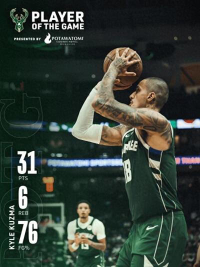 雄鹿:庫茲馬31分6板、波蒂斯27分10板、小波特18分10板13助、特倫特13分2板1助、羅林斯10分2板7助2斷。