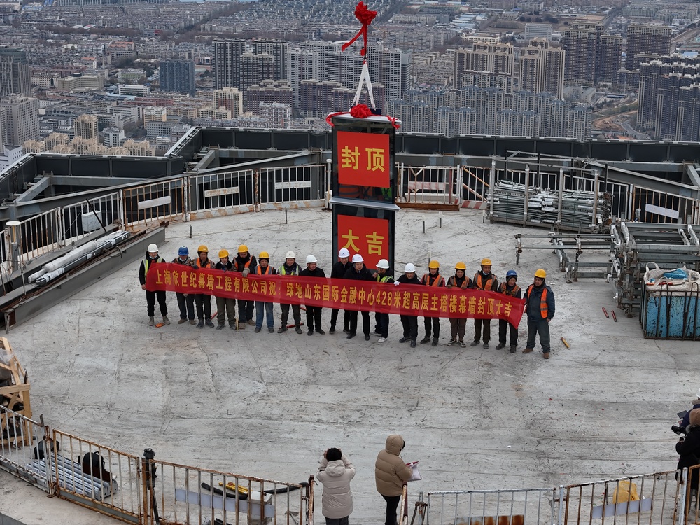 12月12日上午,在濟南中央商務區(qū)“群峰之巔”,隨著最后一塊幕墻單元體的順利吊裝完成,綠地山東國際金融中心(IFC)428超高層項目塔冠幕墻正式封頂,項目整體形象全面成型,齊魯天際線璀璨亮相,以“山”之勢登峰齊魯之巔,為泉城濟南再添一張嶄新城市名片。濟南市歷下區(qū)委書記楊傳軍,中央商務區(qū)管委會主任王海清,綠地山東區(qū)域管理總部常務副總經(jīng)理劉茹濤出席儀式,并共同為最后一塊幕墻單元體掛紅,區(qū)住建局、管委會領導、部分媒體代表,428超高層項目參建各方代表60余人共同見證這一重要時刻。