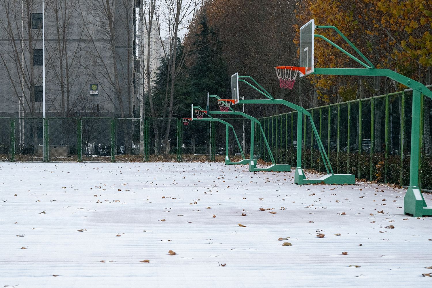 漫步在鄭州財經學院的雪地上,每一步都留下了深深的印記,仿佛在訴說著冬日的故事。籃球場上,綠色的籃筐與潔白的雪地形成了鮮明的對比,靜謐而又充滿生機。
