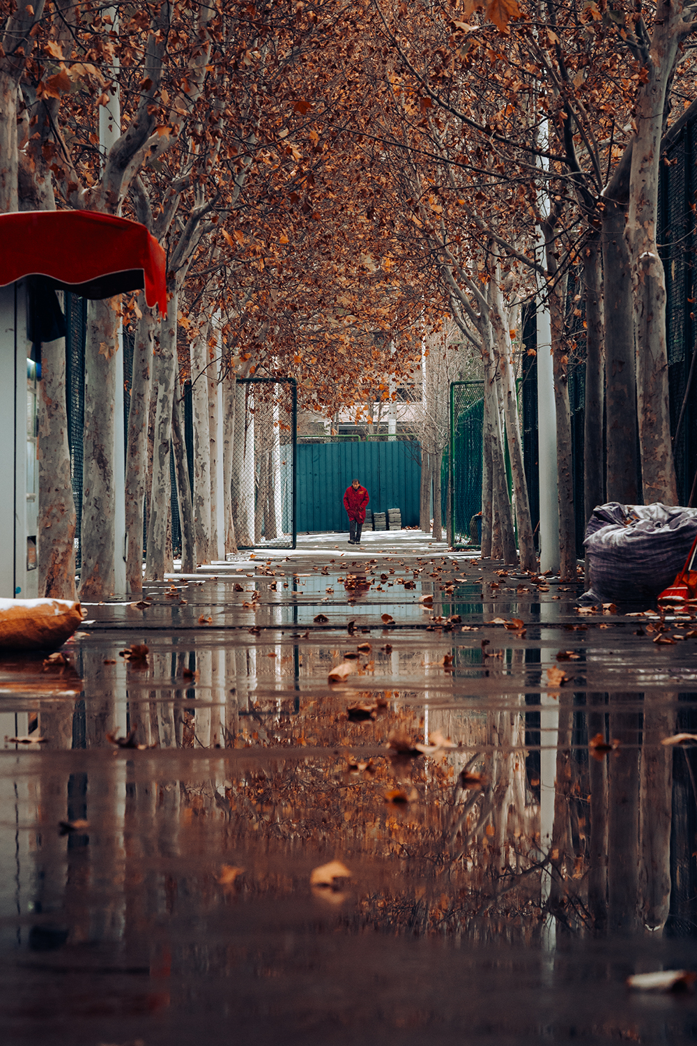 鄭州古樹苑仿佛變成了時空隧道,紅衣行人獨步其中,落葉與雪花共舞,每一步都踏出了歲月的回響。