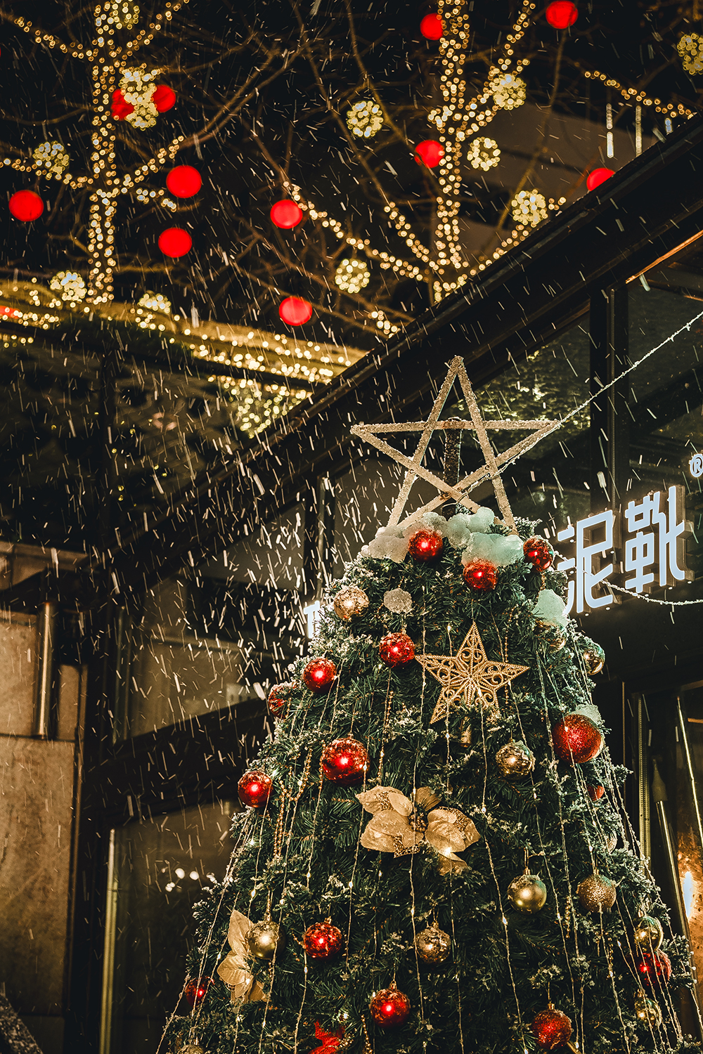 鏡頭下,鄭州萬象城,璀璨的圣誕樹在雪中閃耀,雪花紛飛,像是星星落入了人間,美得讓人心醉。