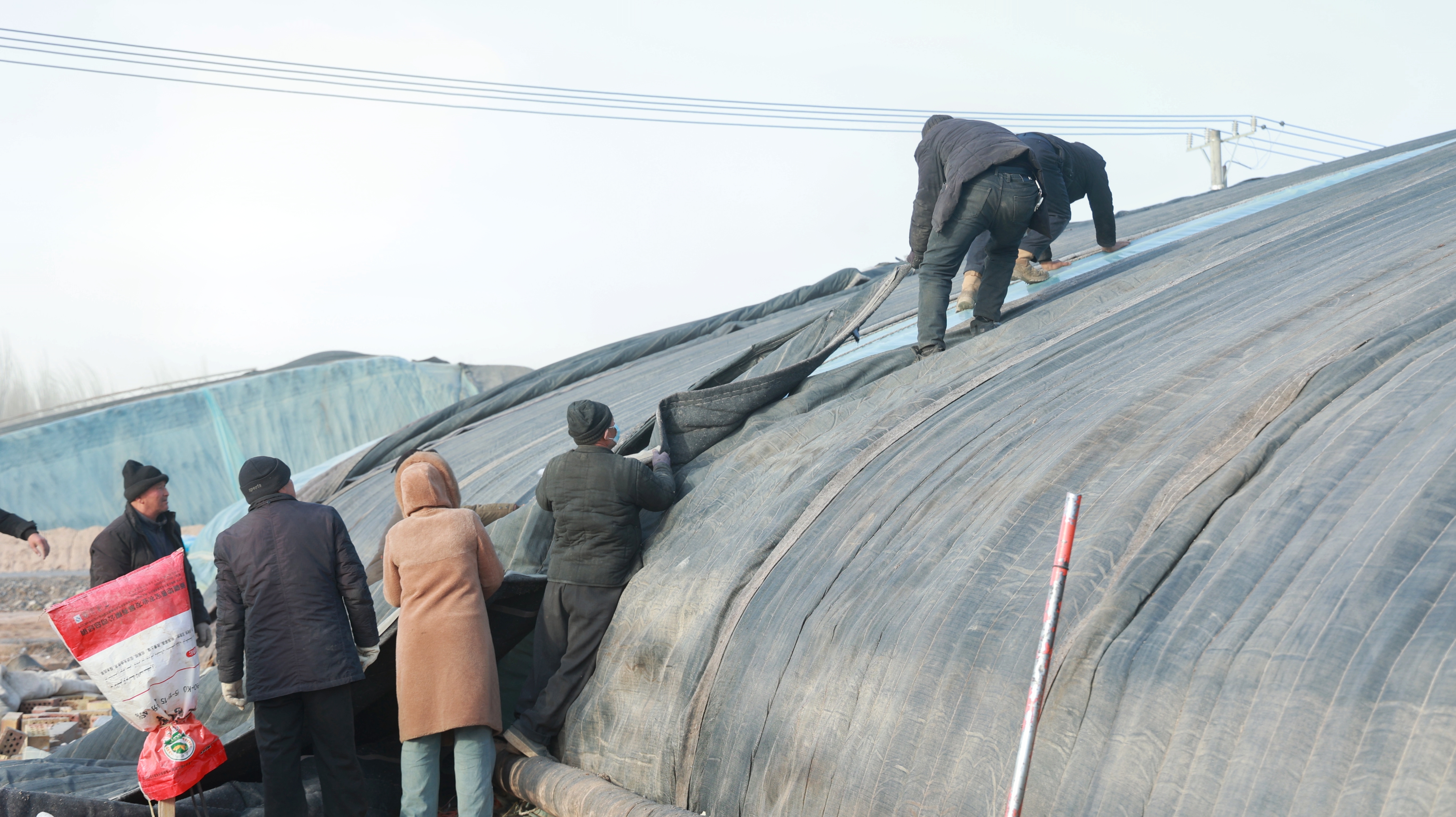 在庫車市烏恰鎮(zhèn)烏恰三村的溫室大棚片區(qū),村民們分工協(xié)作、有條不紊地開展防寒抗凍工作:有的為大棚加蓋厚實的保溫棉被,有的細致檢查并加固棚體連接處的繩索,通過層層防護為大棚“披甲戴盔”,全力抵御冷空氣侵入,守護棚內(nèi)果蔬花卉安全過冬。