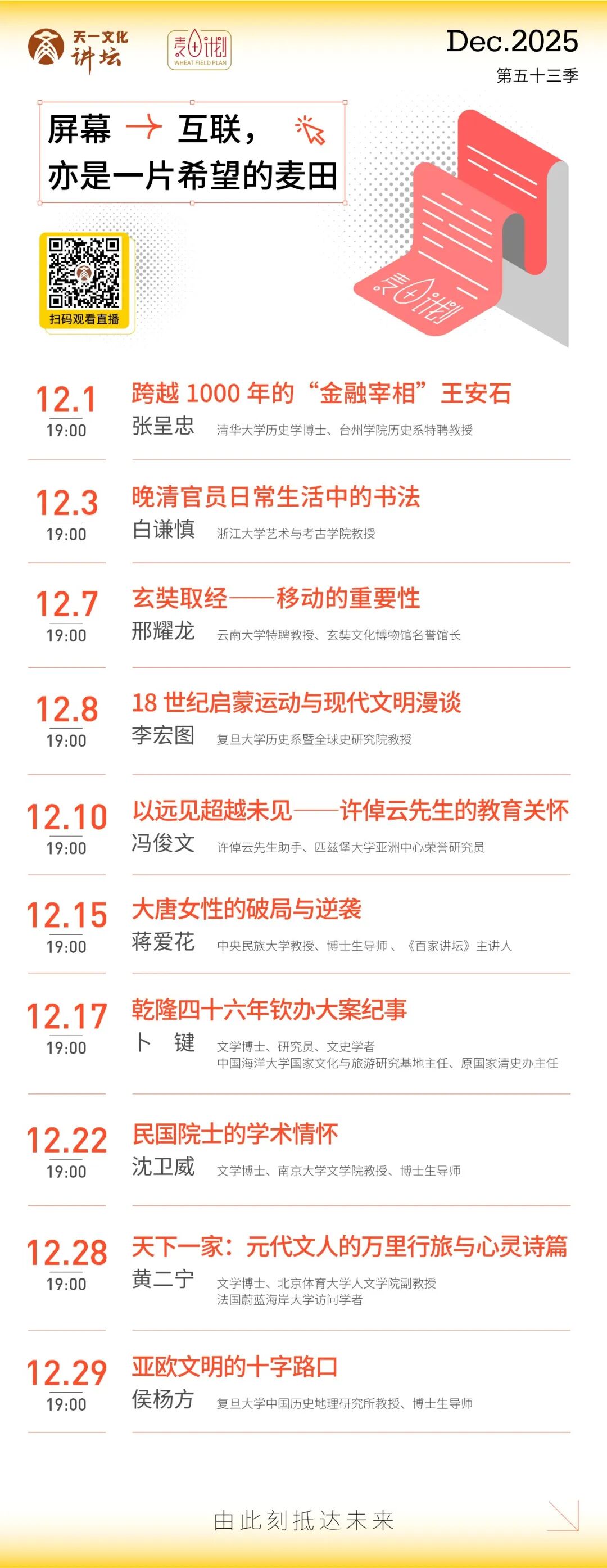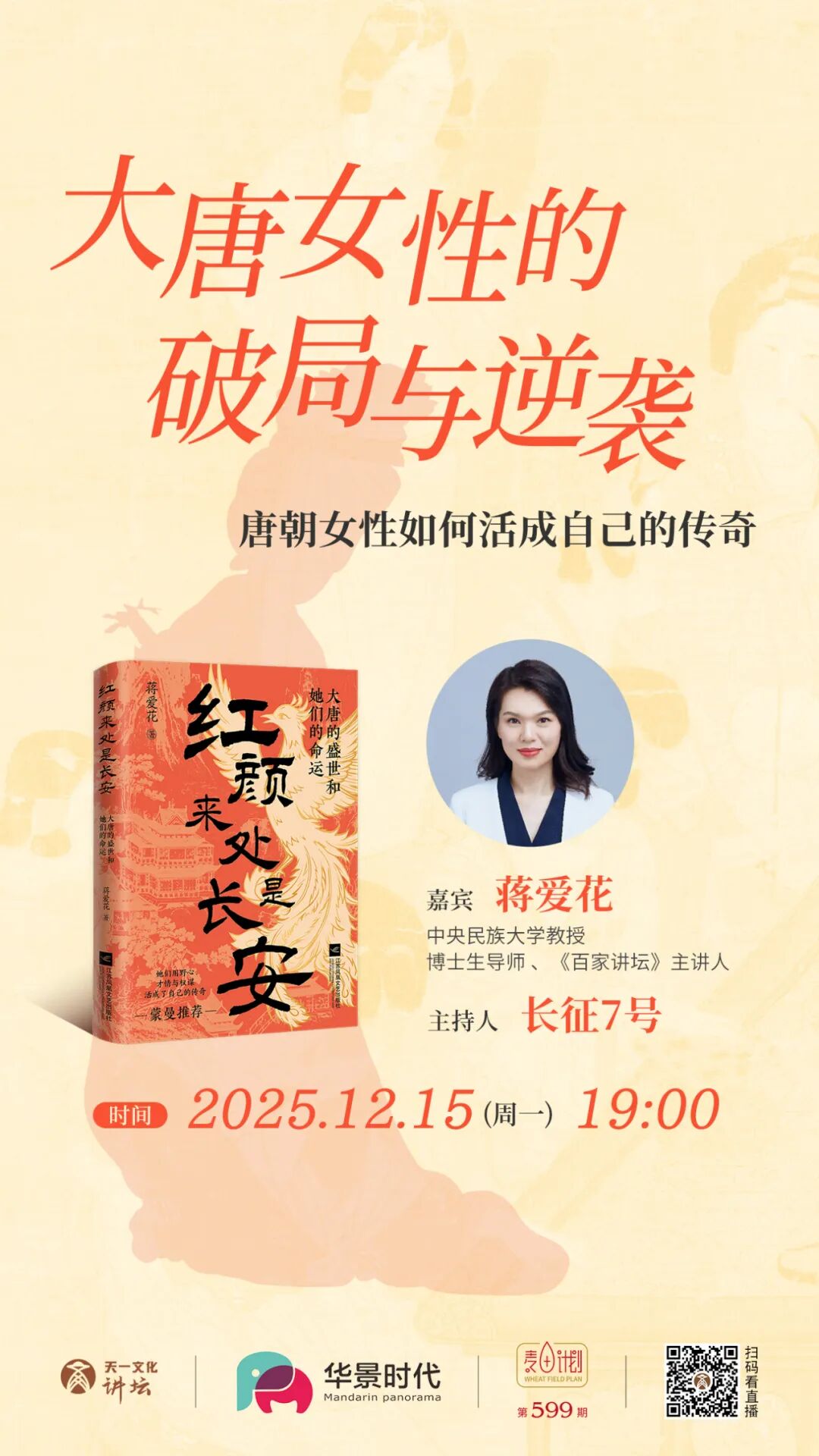 12月15日19:00中央民族大學歷史文化學院教授、博士生導師、《百家講壇》主講人蔣愛花做客天一文化講壇分享大唐女性的破局與逆襲,?歡迎預約、關注、轉發活動。