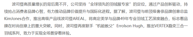 據《中國經濟新聞網》等報道,波司登與國際頂級設計師Kim Jones合作推出高級產品線波司登AREAL系列,定價區間在2399-3999元,展現出較強的產品創新與價值塑造能力。同時,波司登再度聯手“機能教父”Errolson Hugh,推出VERTEX疊變三合一羽絨系列,致力于實現全場景穿著體驗。