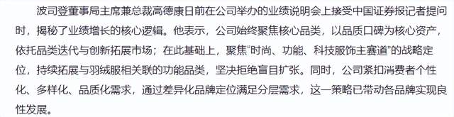 另據《中證網》報道,波司登董事局主席兼總裁高德康表示,公司始終聚焦核心品類,以品質口碑為核心資產,依托品類迭代與創新拓展市場;在此基礎上,聚焦“時尚、功能、科技服飾主賽道”的戰略定位,持續拓展與羽絨服相關聯的功能品類,堅決拒絕盲目擴張。