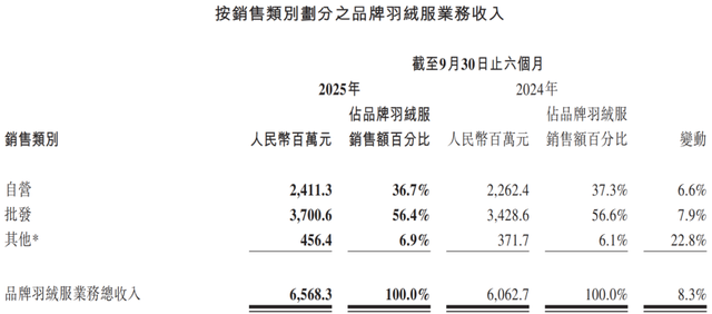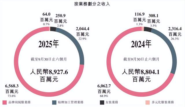 分業務板塊看,波司登的表現呈現明顯差異。品牌羽絨服業務作為其核心業務,報告期內收入達65.68億元,同比增長8.3%,占總營收的73.6%。