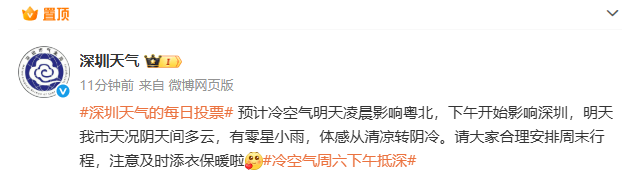據(jù)“深圳天氣”消息,預(yù)計(jì)冷空氣將于明天(12月13日)凌晨影響粵北地區(qū),并于當(dāng)日下午開始影響深圳。