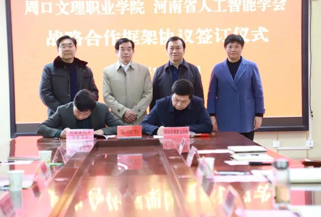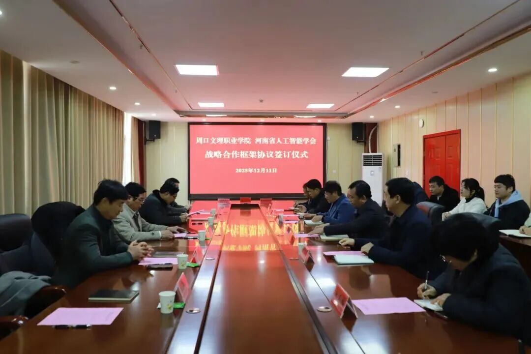2025年12月11日上午,省人工智能學會與周口文理職業學院簽署戰略合作框架協議。學會專家、省政府教育督導團原副總督學吳廷偉,學會專家、河南財政金融學院原黨委副書記田俊廷,學會副理事長兼秘書長馬廣建,周口文理職業學院黨委書記宋曉東,周口文理職業學院校長于秀邦,周口文理職業學院副校長武金娟出席活動。周口文理職業學院黨政辦公室、教務處、信息工程學院、文化旅游學院等相關單位負責人、教師代表,省人工智能學會秘書處同志參加活動。儀式由周口文理職業學院副校長武金娟主持。