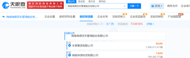 至此,王廣西通過直接或間接方式控制了3家上市公司。天眼查股權穿透顯示,截至12月11日,王廣西分別持有永泰能源、海德股份17.90%、73.00%股份,均為實控人。海倫哲目前雖處無控股股東、實控人狀態,但王廣西控制的海德資管持有12.34股份,是第一大股東。