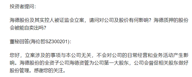 截至12月11日,海德股份股價6.82元,較立案公告當日最高的7.79元9個交易日累跌12.45%,市場有避險觀望情緒。