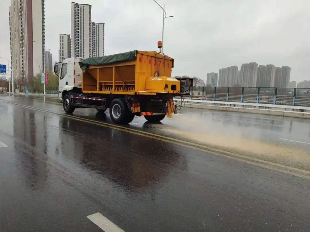 發現雪情后,惠濟區城市管理局即刻啟動應急響應,各部門進入待命狀態,隨時準備接受調度指令。將橋梁涵洞、高速上下匝道等易結冰路段列為首要保障點位,堅持“預防為先、快速處置”,第一時間對轄區內所有橋洞、立交橋、快速路匝道等重點路段開展融雪劑拋灑作業。作業隊伍按照預設路線分區分片推進,做到“雪下即撒、隨下隨補”,通過科學控制拋灑量,既加速積雪融化、防止路面結冰,又避免對周邊環境造成影響,確保交通關鍵節點始終暢通無阻。截至目前,累計對轄區重點橋洞、橋梁等區域拋灑融雪劑數十噸,有效保障了車輛通行安全。此外,加大巡查頻次,一旦發現路面降雪或結冰跡象,立即上報并處置;各作業單位及時反饋道路通行情況,確保信息實時互通。目前轄區道路通暢無積雪。