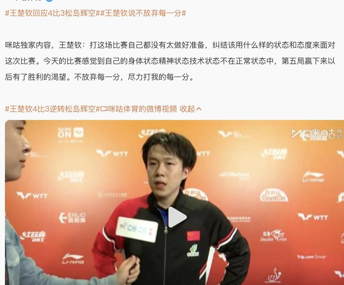 比賽結束后,當被問到這場勝利時,王楚欽直言自己贏得很僥幸,他說松島輝空發揮得非常好,前面自己打得確實沒有什么辦法,甚至都在想著可能要拎包回去了。