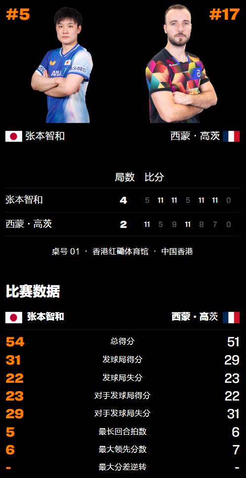 第六局張本智和士氣大增開局連得2分,西蒙隨即叫出暫停進行調整。重返賽場后,西蒙追至2-3但隨后不斷被拉開差距,最終在6-10出現賽點后以7-11落敗,張本智和由此而逆轉獲得晉級。