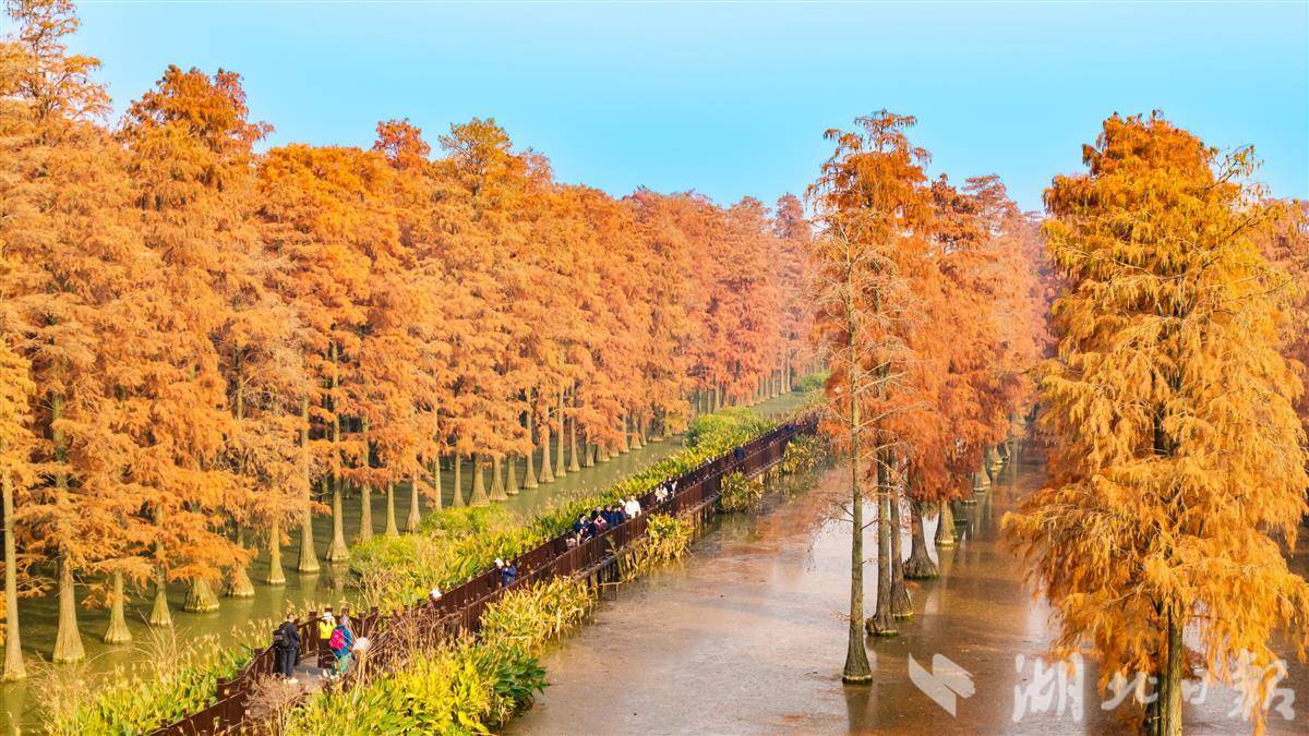 12月11日,武漢市新洲區漲渡湖濕地森林公園的萬余棵池杉樹葉由青轉紅,色彩斑斕,景美如畫,吸引許多游客前來拍照打卡。據介紹,這片600畝美洲池杉試種于1973年,目前樹高達20多米,已形成林水相依、鷺鳥翔集的水上森林奇觀,成為周邊市民打卡的“網紅地。(視界網 王江 攝)