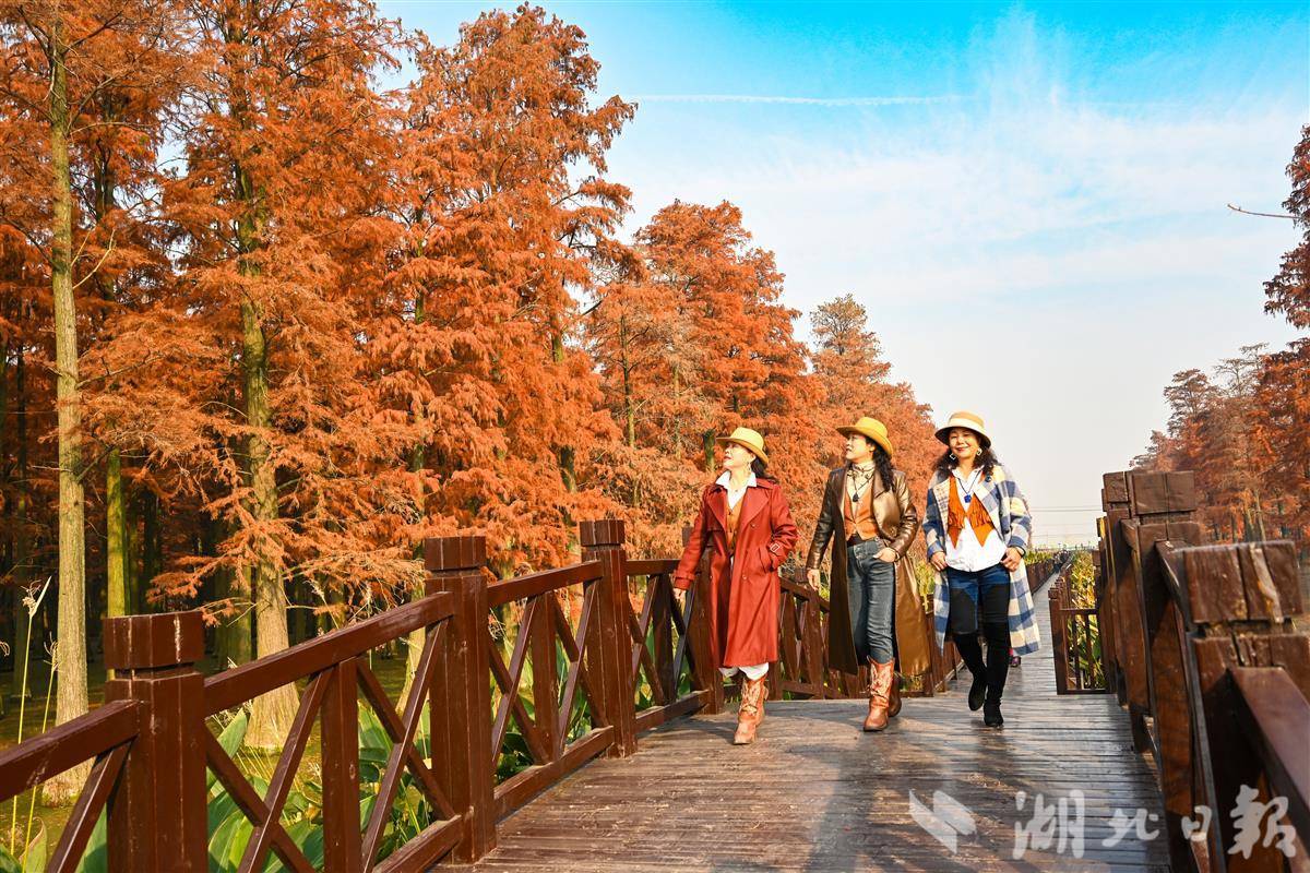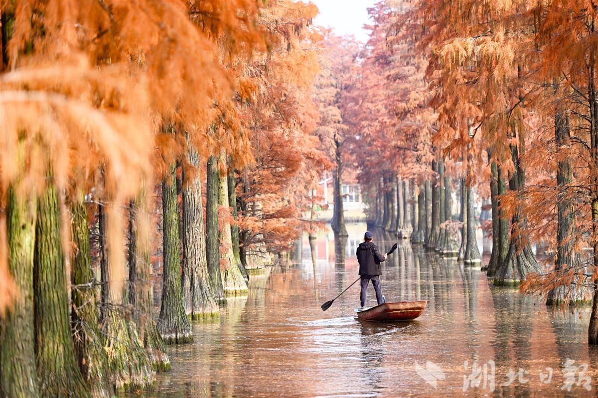 12月11日,武漢市新洲區漲渡湖濕地森林公園的萬余棵池杉樹葉由青轉紅,色彩斑斕,景美如畫,吸引許多游客前來拍照打卡。