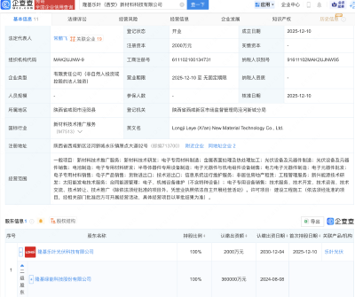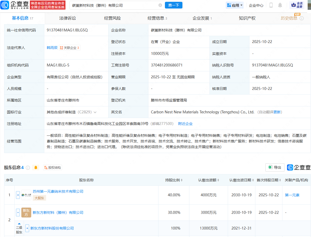 企查查APP顯示,碳巢新材科技(滕州)有限公司成立,法定代表人為韓雨辰,注冊資本為1億元,經營范圍包含:高性能纖維及復合材料制造;電子專用材料制造;電子專用材料研發;電池制造;石墨及碳素制品制造等。企查查股權穿透顯示,該公司由蘇州第一元素納米技術有限公司、東方材料(603110)全資子公司新東方新材料(滕州)有限公司等共同持股。