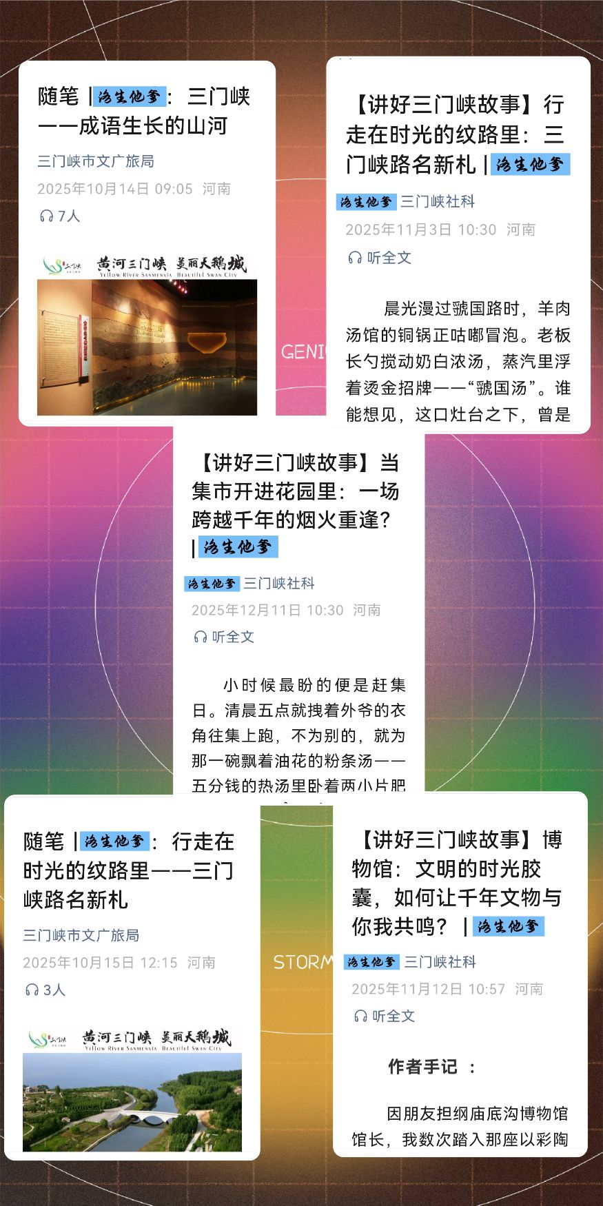 從評到寫,是講述的開始。我心里一直有個愿望:想講講居住的這座城市的故事。然而念頭雖多,卻苦于沒有合適的平臺,始終未能真正動筆。直到在頂端新聞遇到契機,這個想法才被重新點燃。我開始系統(tǒng)地搜集資料、查閱方志,決心用筆墨勾勒家鄉(xiāng)的風土與文化。于是,便有了《行走在時光的紋路里:三門峽路名新札》《三門峽:成語生長的山河》《大天鵝之城:四季果香里的平仄市行》等文章。這些作文,不只是在講述“大天鵝之城”的故事,也是在書寫“大象河南”的篇章。欣慰的是,其中幾篇還被市文廣旅局、市社科聯(lián)的微信公眾號轉載。特別感謝市社科聯(lián)張主席、文廣旅局楊局長的鼓勵與指點。楊局長是位“女秀才”,張主席更是文章大家,他在頂端的賬號“熱圖評說”文筆極佳,我常默默學習。與他們相比,我自認仍是“小學生”,但能與優(yōu)秀者同行,將曾經的沖動落為文字,內心已十分滿足。
