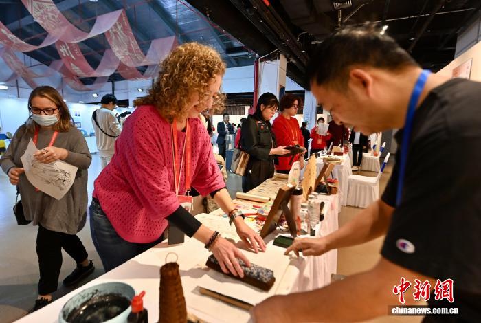 12月12日,外國友人現場體驗四川綿竹木版年畫制作技藝。當日,“非遺無界·絲路同輝——海上絲綢之路非物質文化遺產展”在福建泉州舉辦。中新社記者 王東明 攝